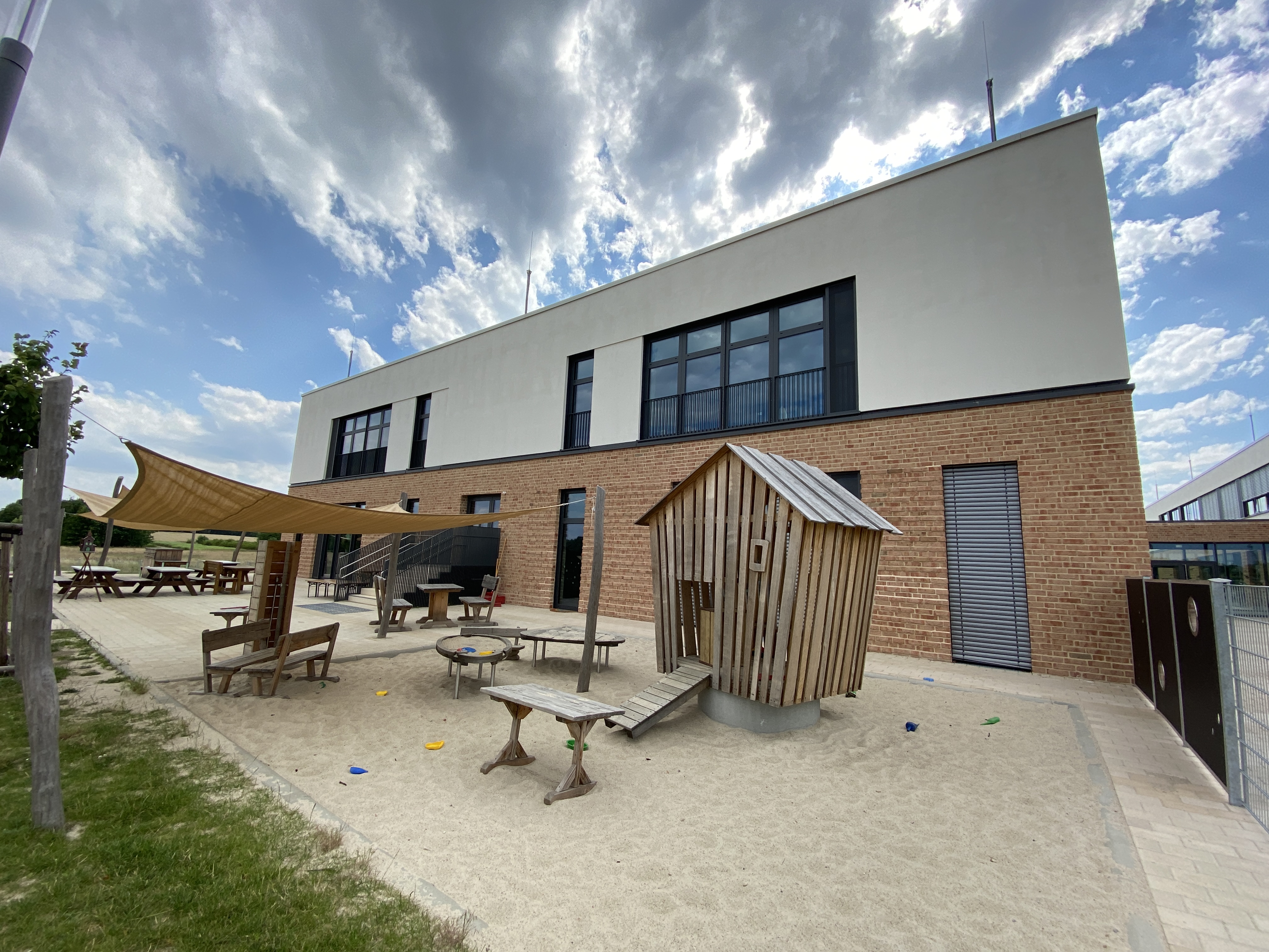 Kita-Gebäude von der Rückseite mit Sand-Spielplatz © Hoffbauer