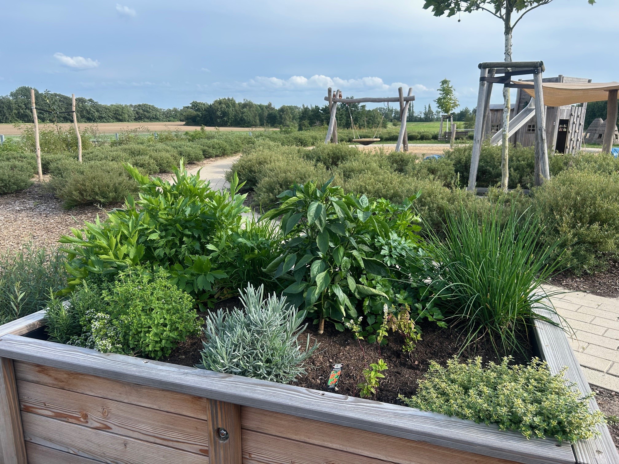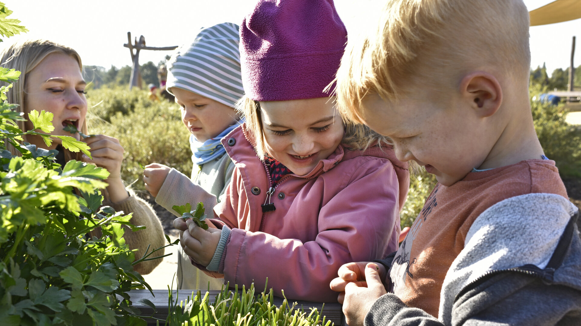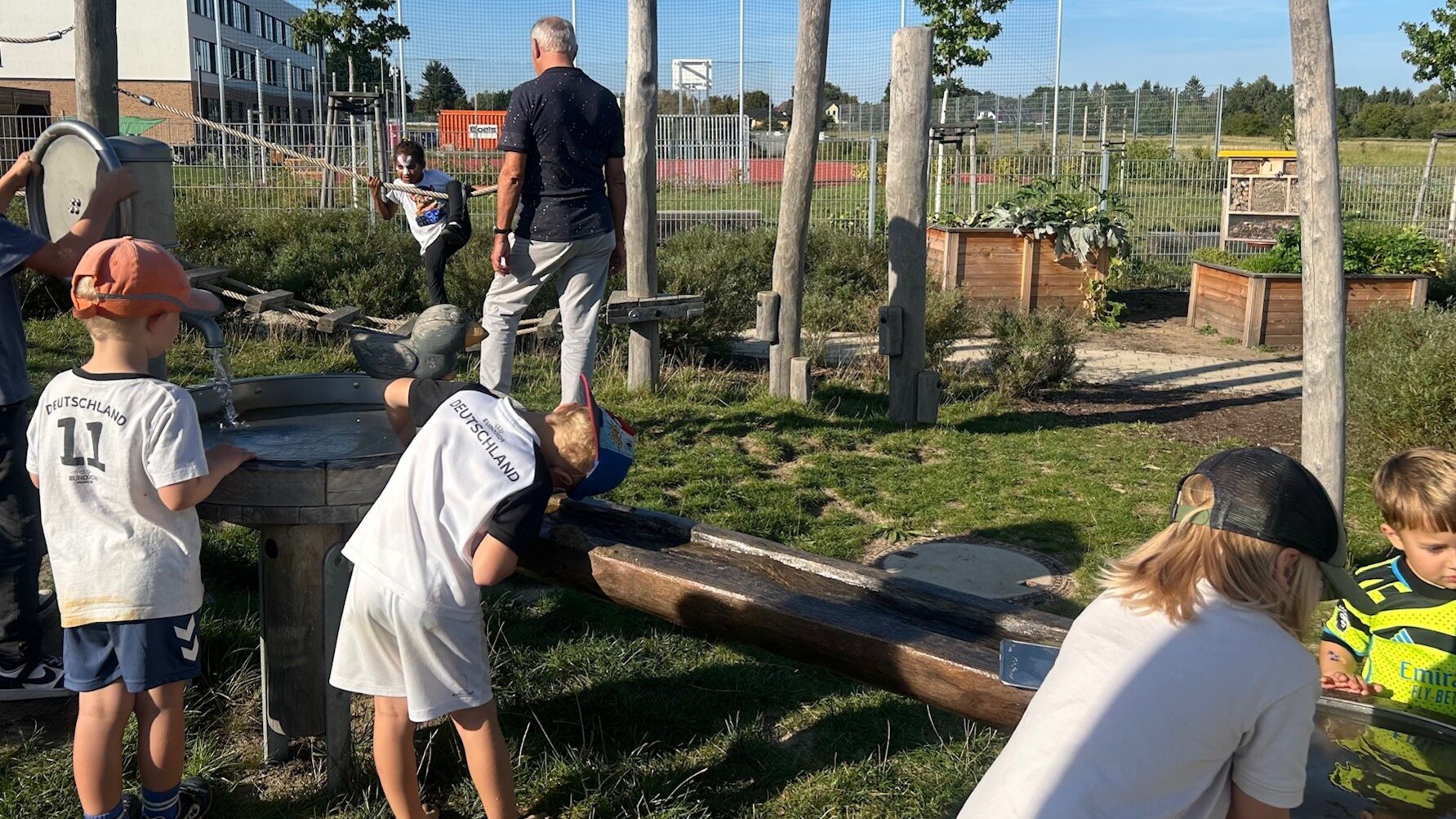 Unser Außenbereich lädt jeden Tag zum Spielen und Entdecken ein! Die Kinder können sich an der Matschanlage und auf der Rutsche ausprobieren, den großartigen Ausblick von unserem kleinen Aussichtsturm genießen, in den Weidentipis spannende Pläne schmieden oder einfach nur die Obstwiese erkunden und auf der Wiese entspannen. Gemeinsam mit unseren pädagogischen Mitarbeitenden pflegen die Kinder die Hochbeete und freuen sich über die leckere Ernten.